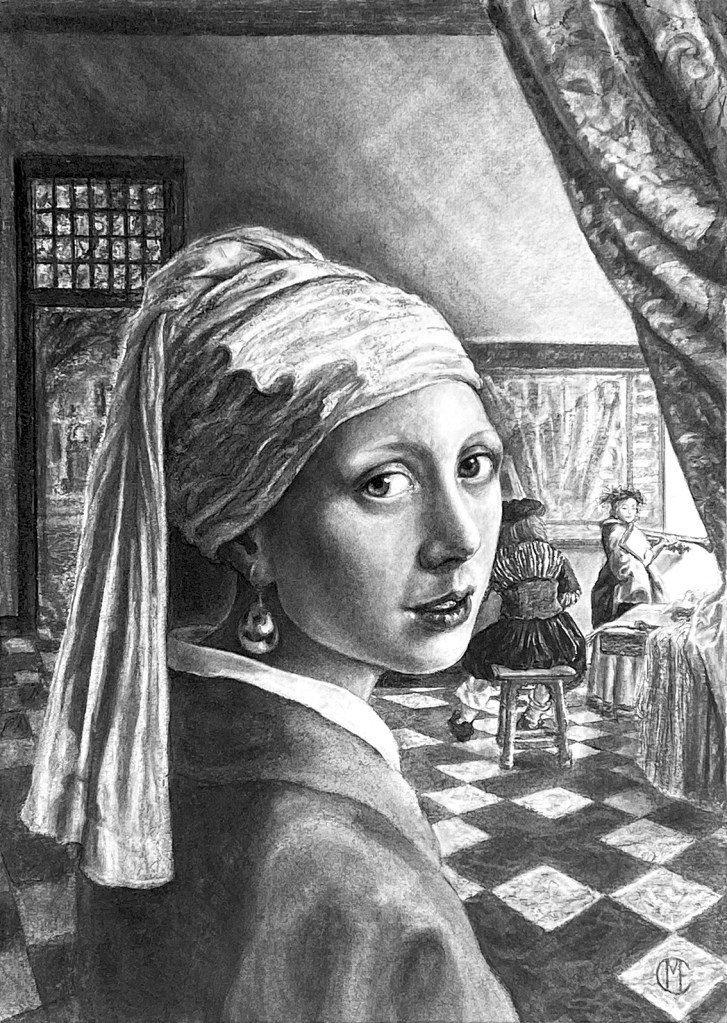 Charcoal drawing imagining the ‘Girl with a Pearl Earring watching Johannes Vermeer paint.