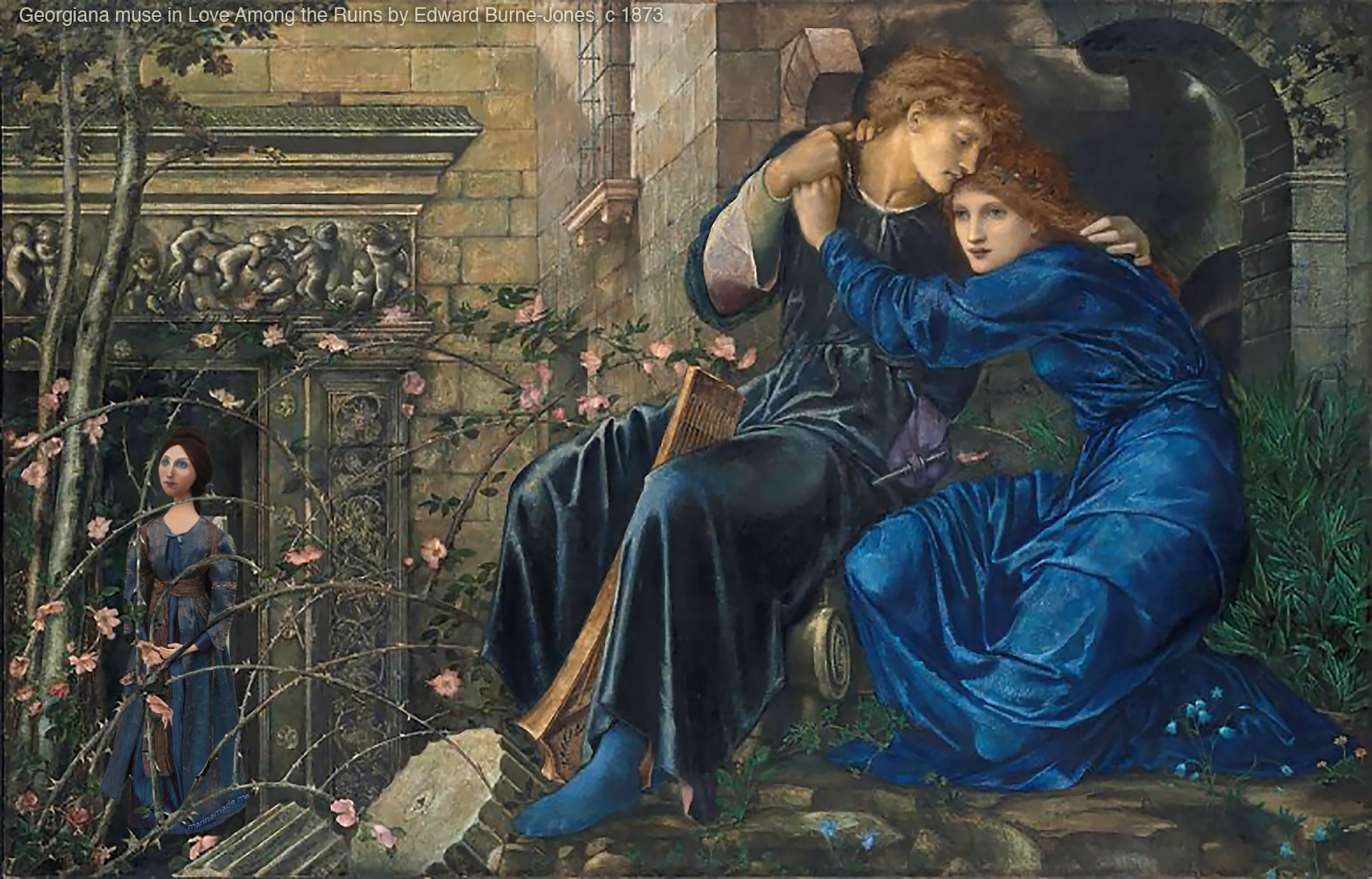 Gradually Georgiana became acquainted with artists of the Pre-Raphaelite circle, visiting the studio where Ned worked with Rossetti and Morris as well as meeting Ned’s idol, John Ruskin at the National Gallery.