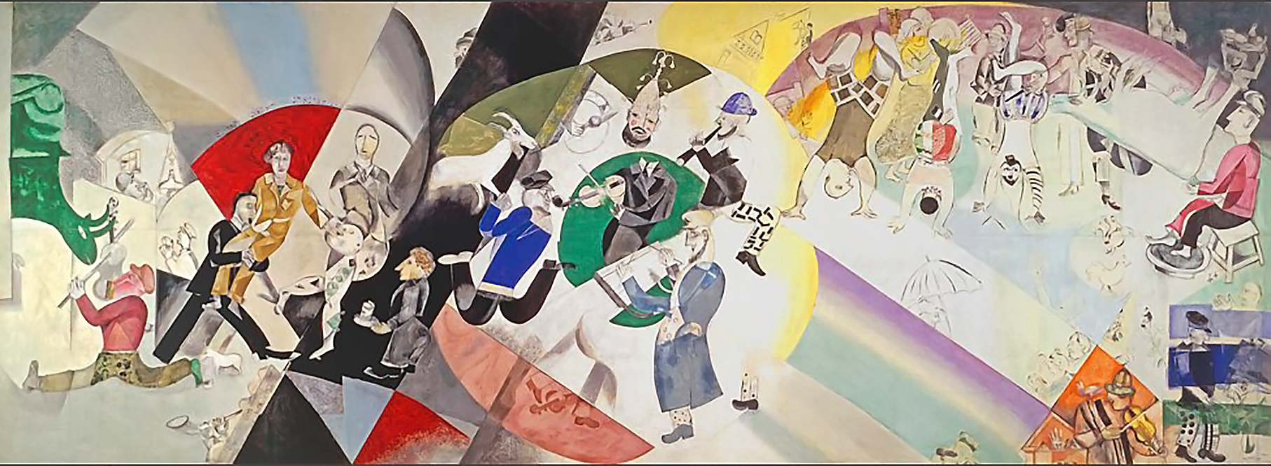Chagall enjoyed this relatively brief time working on several huge murals over 7 metres long and nearly 3 metres high. He created various lively Yiddish scenes for humorist, Sholem Aleichem’s one act plays, including in them his characteristic dancers, fiddlers, acrobats and farm animals. Bella would sometimes watch him at his work, while he painted the stage sets, curtains and ceiling for the small auditorium.