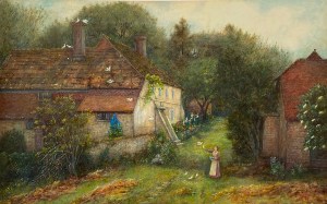 Kelmscott Manor, ‘Feeding Doves in Kitchen Yard’, 1904. Society of Antiquaries of London, Kelmscott Manor. Cherry Orchard in Kent, 1915, both paintings in watercolour and gouache, by Marie Spartali Stillman. Private collection.