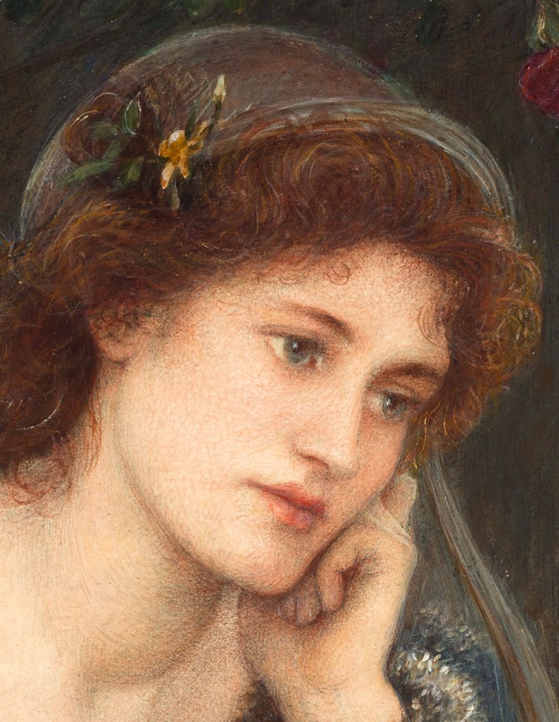 Detail of ‘Beatrice’ showing fine brush strokes. ‘Beatrice’ 1896, watercolour and gouache mounted on board, by Marie Spartali Stillman. Delaware Art Museum.