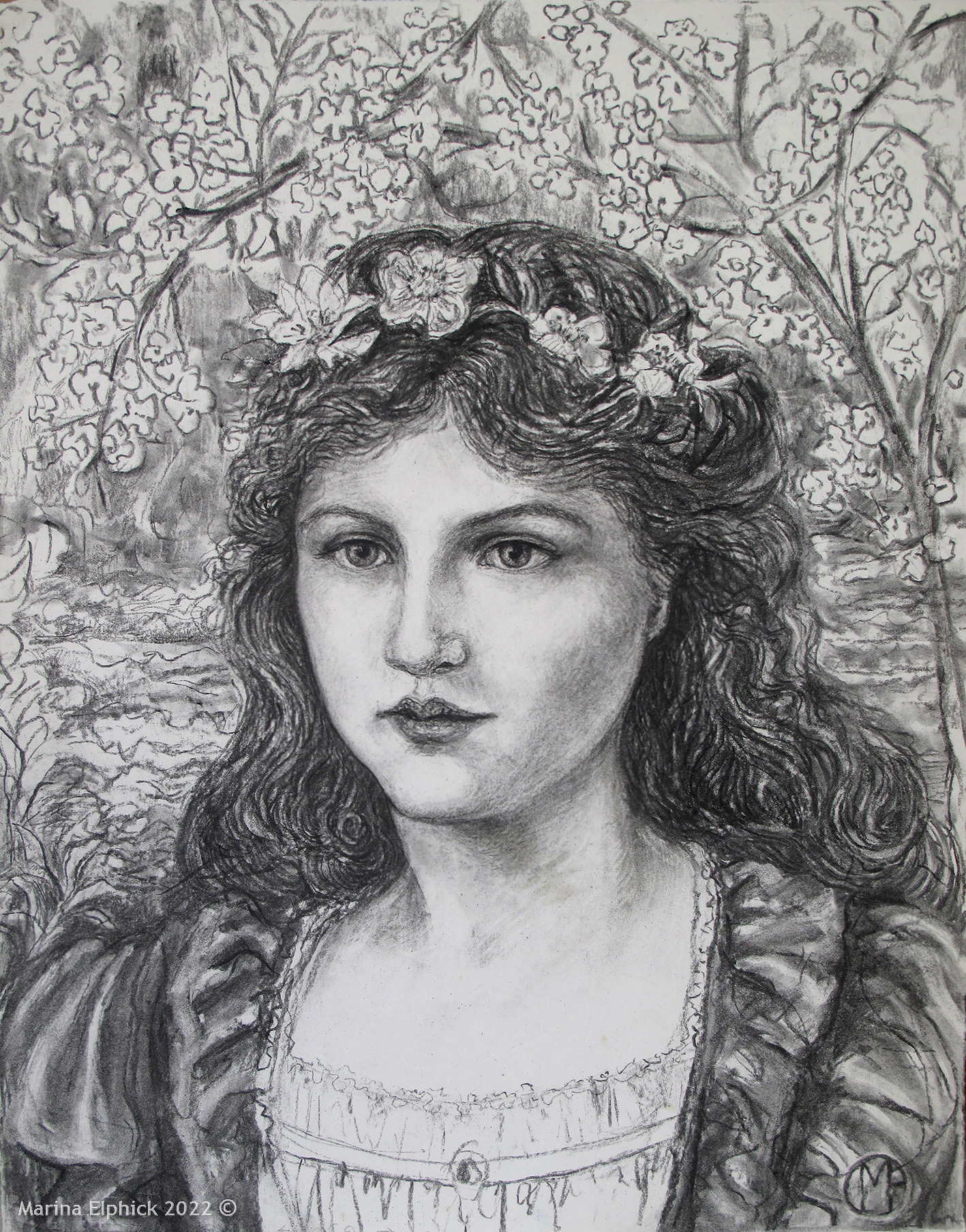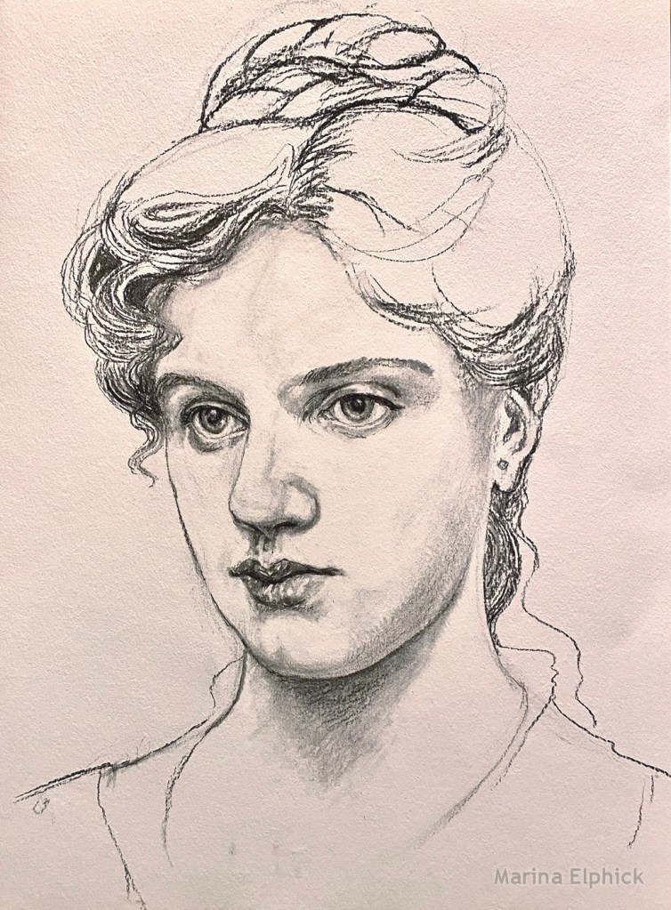 Charcoal drawing of Marie Spartali by Marina Elphick 2022
