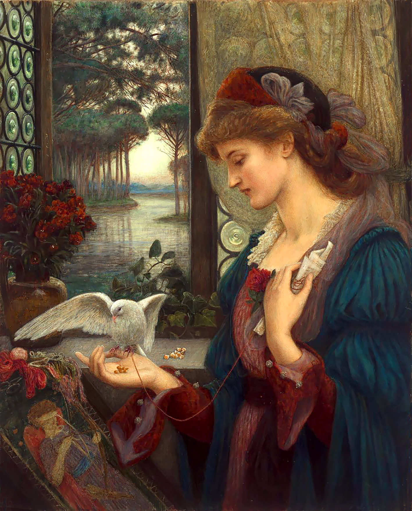 Love’s Messenger, 1885, Marie Spartali Stillman, watercolour, tempera and gold paint on paper. Delaware Art Museum, Samuel and Mary Bancroft Memorial.