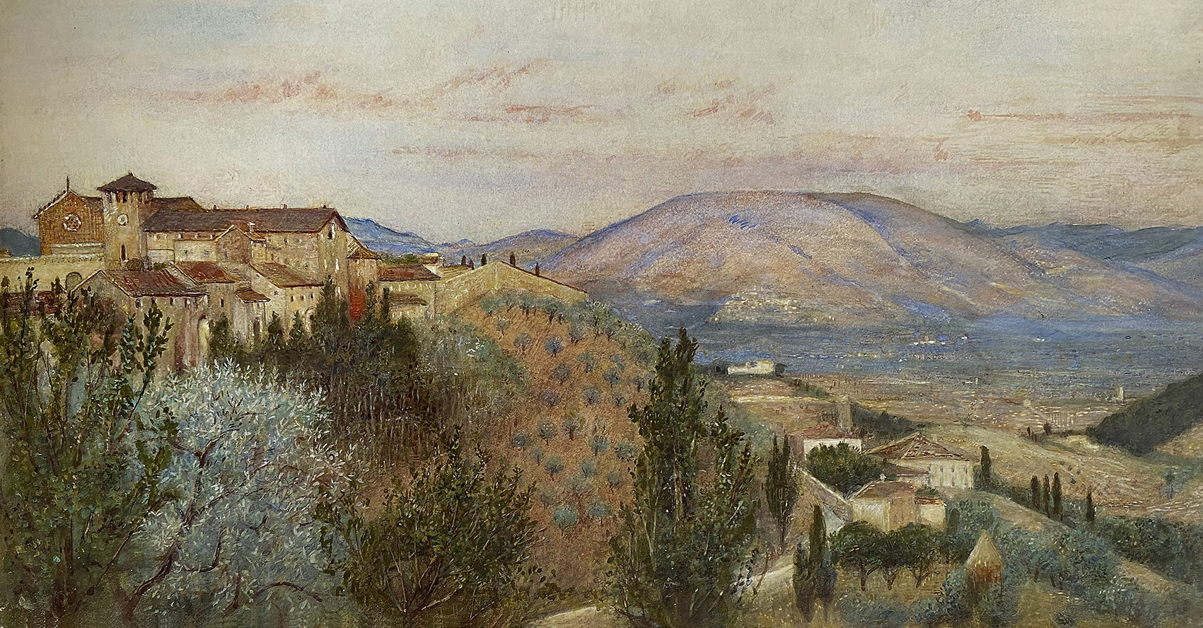 Left: Monte Luce from Perugia at Sunset, 1893, watercolour and gouache on paper, by Marie Spartali Stillman. Private collection.