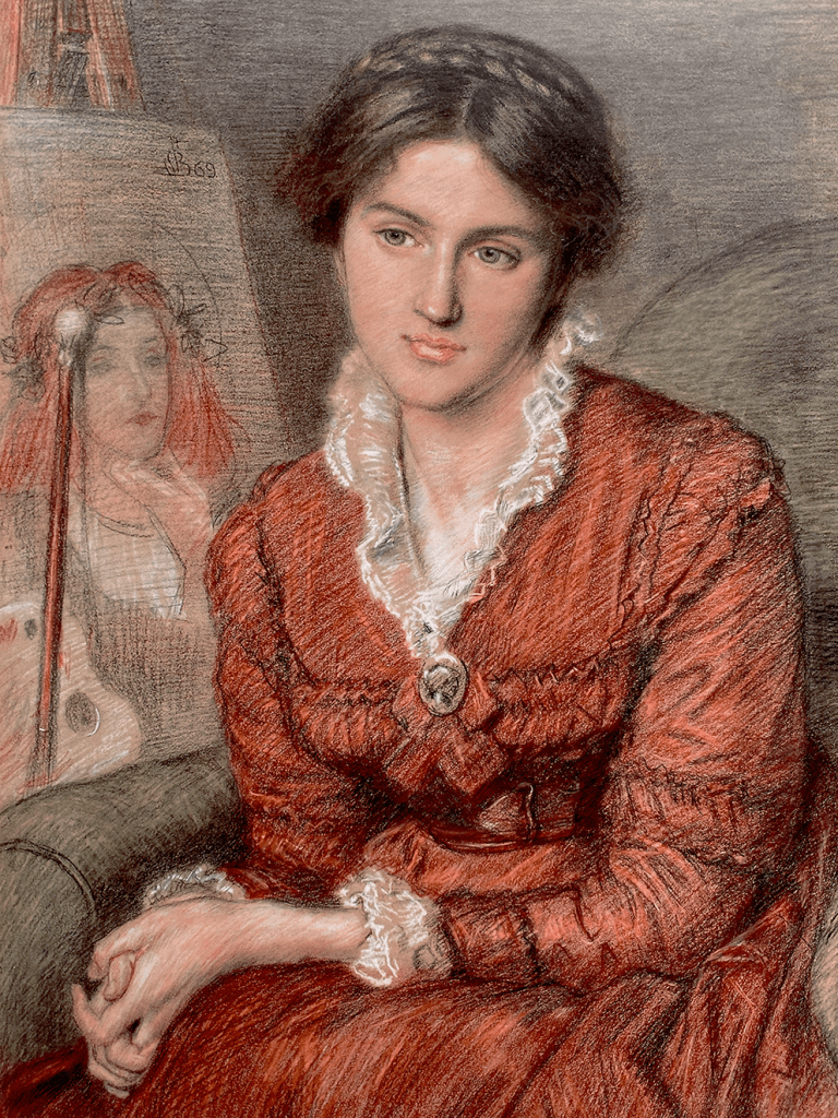 Marie Spartali at Her Easel 1869, by Ford Madox Brown. Private collection. Study for the Head of Ismene, red chalk on paper, by Marie Spartali c. 1868. Location unknown.