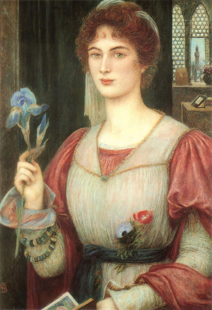 ‘The childhood of Saint Cecily’, 1883 watercolour and graphite, enhanced with gouache, by Marie Spartali stillman. Beatrice, by Marie Spartali Stillman, 1898, watercolour, gouache and graphite on paper. ‘Madonna Pietra degli Scrovigni’, 1884 watercolour and gouache on paper, by Marie Spartali Stillman. Walker Art Gallery, Liverpool.