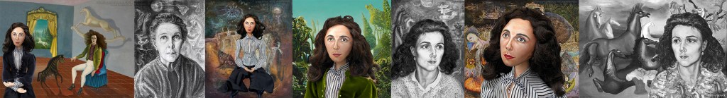 Leonora muse in front of a version of, ‘les distractions de dagobert’, by Leonora Carrington, 1945.