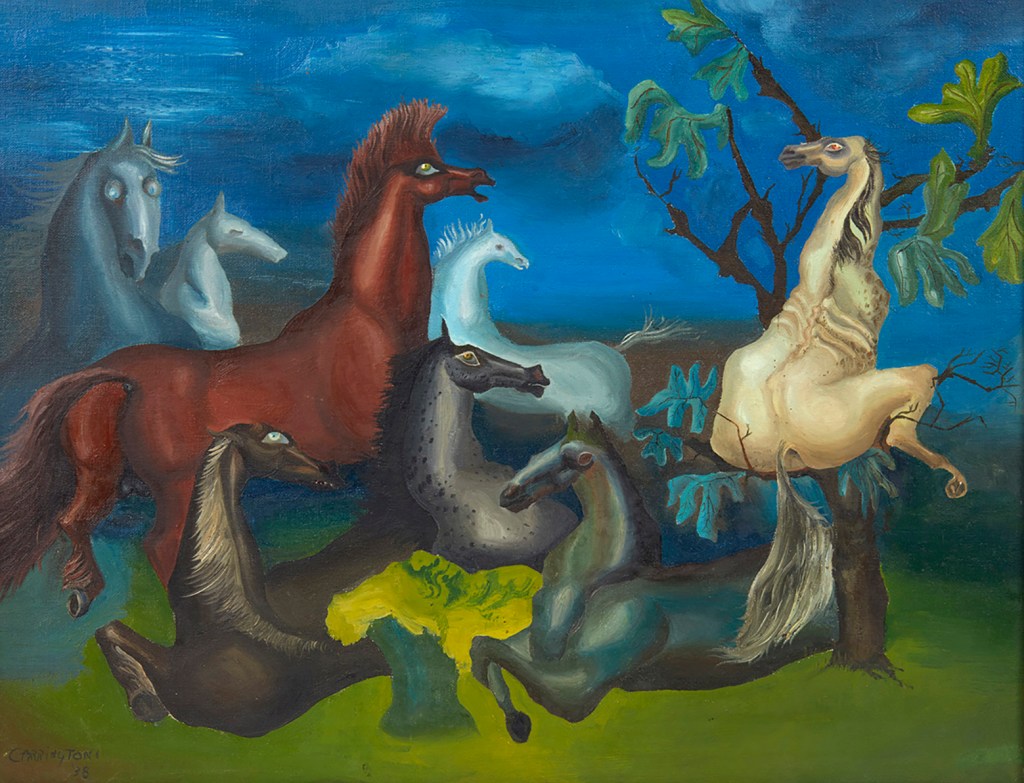 Leonora had three paintings included in the exhibition, ‘Self-Portrait (Inn of the Dawn Horse), ‘The Horses of Lord Candlestick’ and ‘The Meal of Lord Candlestick’. It was a transformational moment for Leonora, she was barely twenty one and had joined the greatest names of twentieth- century art to take part in this momentous art exhibition. During this time Peggy Guggenheim, the wealthy art collector came into their lives. While visiting Max’s studio, she spotted Leonora’s painting ‘The Horses of Lord Candlestick’ and wanted to buy it for her collection Modern art.