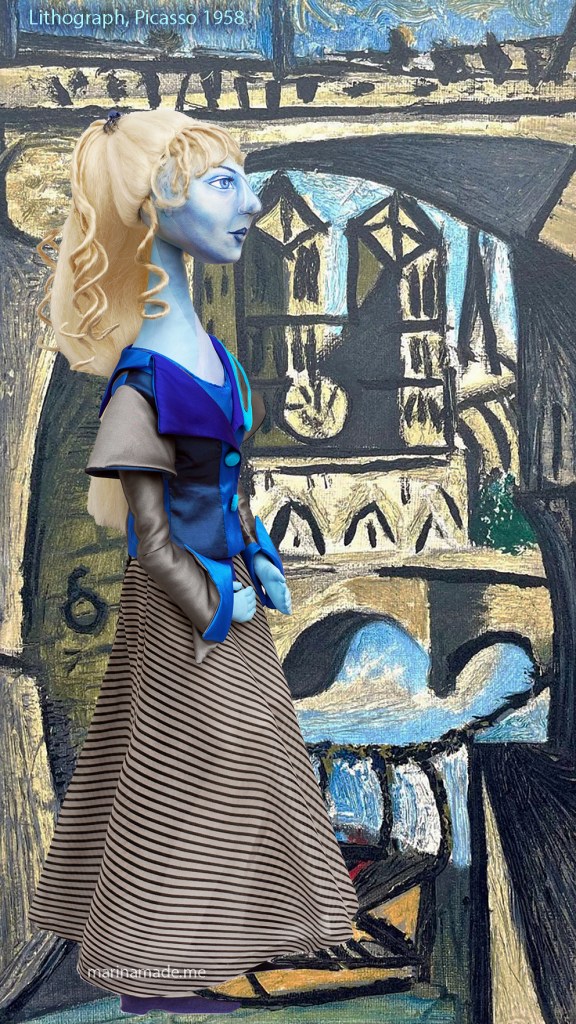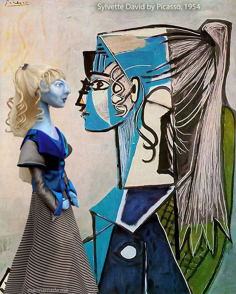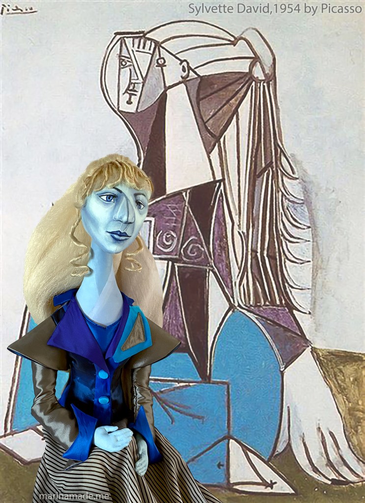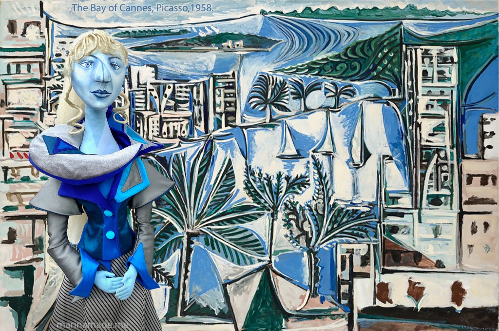 My muse Marie-Thérèse, set against Picasso’s ” Dejeuner sur l’herbe”. Marie-Thérèse muse, seated in front of Picasso’s painting of her, “Femme avec Livre” ,1932.Marie-Thérèse muse in Picasso’s studio. Hand made in silk and cotton by Marina Elphick.Art Muse Marie-Thérèse, set against Picasso’s Mougins Landscape. Marie-Thérèse muse, seated in front of Picasso’s painting. Marie-Thérèse muse with “Painter and his Model”, 1963 by Pablo Picasso.Marie-Thérèse muse with “small house in the garden”, 1908 Picasso.Marie-Thérèse muse in Provence. Painting by Picasso, 1965.Marie-Thérèse muse detail, right side of face.Art Muse Marie-Thérèse, set in ” Large still Life in Blue” 1931, Picasso.Marina’s art muse Marie-Thérèse, set