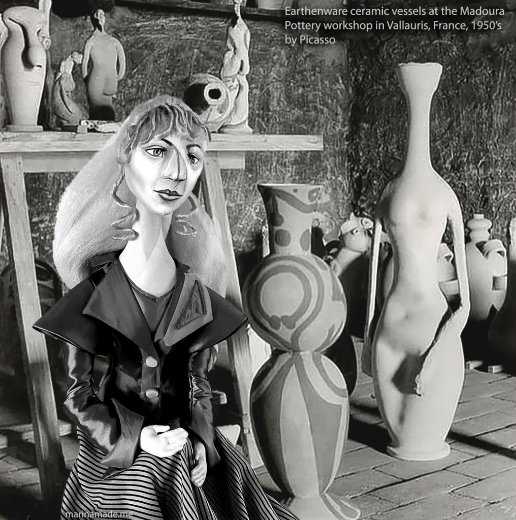 Dora Maar muse with Picasso’s epic painting Guernica, exhibited at Paris International Exposition in 1937. Dora Maar, Picasso’s muse and lover, photographed the painting in progress. Dora muse with “Portrait de Femme”, 1942, Picasso.Marina’s muse Dora is set in “Dora Maar in Armchair” painted by Picasso in 1939.Dora Maar muse with Picasso’s “Matador.”Muse, Dora Maar with the painting that inspired her, “Bust of a Woman “, 1938, by Pablo Picasso.Dora Maar muse in ” Maisonette dans un jardin” by Picasso 1908.Muse, Dora Maar set in Picasso’s painting, “Studio in California”, 1956.Marina’s muse of Dora Maar in front of Picasso’s painting, “Mandelin et Guitare”.Dora Maar with Cubist person, by Picasso 1917.Dora Maar muse with “Les Femmes d’ Alger”, by Picasso 1955; colour adjusted by Marina.Dora Maar muse set in Picasso’s painting, ” La Rue des Bois”, 1908.Detail of Dora Maar muse in ” Maisonette dans un jardin” by Picasso 1908. Dora Maar was a renowned Surrealist photographer and artist herself.Dora Maar muse, side head detail.“Painter and his model in a Landscape,” 1953 by Picasso, with Dora Maar muse facing outward.Dora Muse with Le baiser by Picasso.Dora and ‘The Muse’, 1935 by Picasso. Dora Maar was a talented photographer and artist herself.Muse, Dora Maar in Picasso’s studio, photograph by André Villers.Dora Maar muse with “The Three Dancers,” by Pablo Picasso, 1925. Dora muse, The artist with his model by Picasso, 1963. Dora Maar muse in Frosty lane. Inspired by Picasso, created by Marina Elphick and photographed near her home in Sussex.